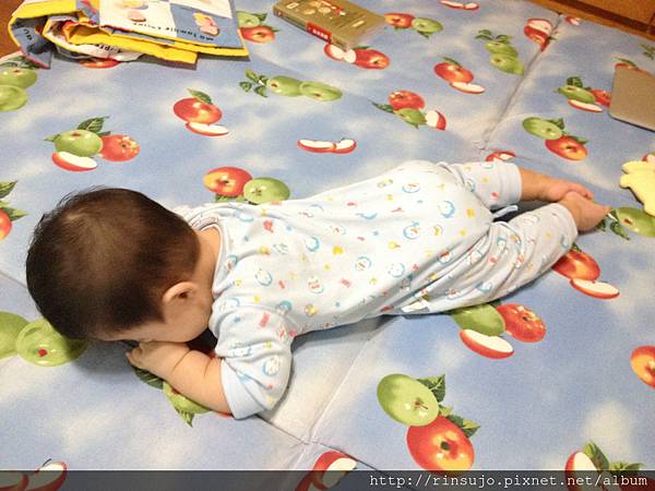 小湯快7個月大時,穿起來非常剛好!幸好還有多買一件80公分,不然哆啦a夢很快就要退役了。