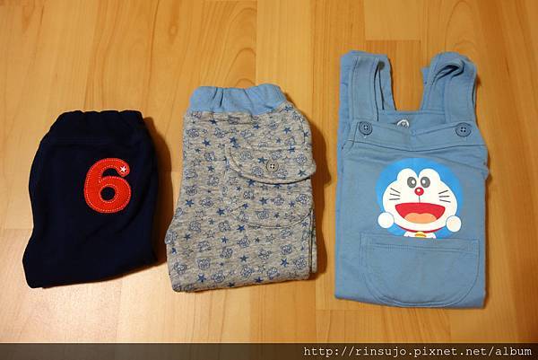 因為媽媽估錯尺寸,目前只有穿到最左邊那件深藍色的長褲跟吊帶褲,中間那件都還沒機會穿到