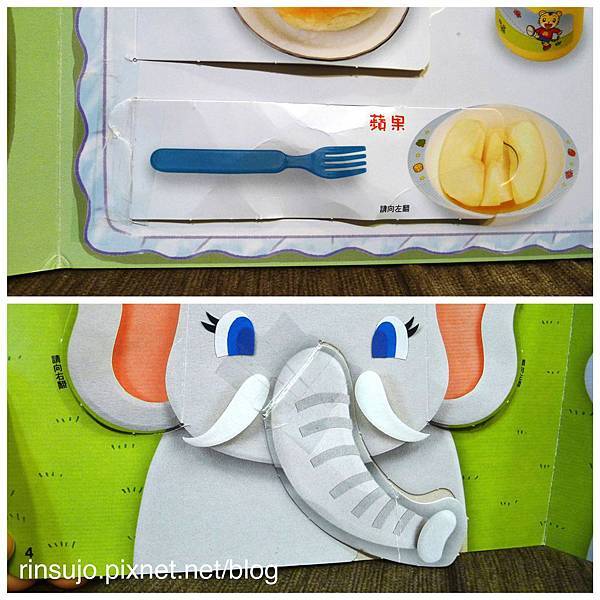 更神奇的是,當我把書翻開,他看到大象抱小象,居然會用手指著畫面喊「抱抱」