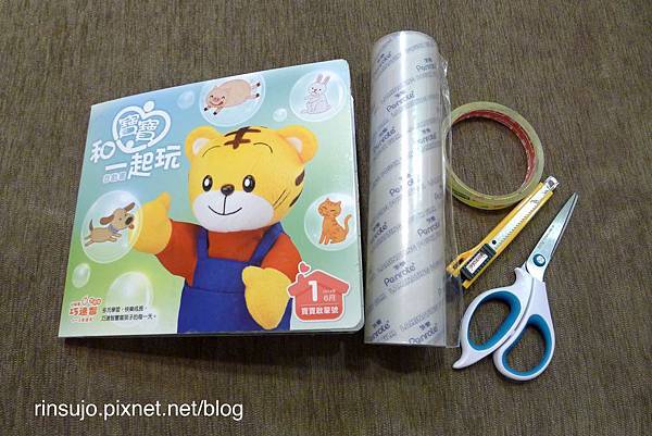 準備的工具:想保護的書、自黏膠膜、膠帶、剪刀、刀片、尺