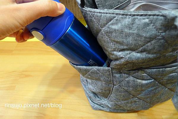 看起來很小的側邊口袋,可以放膳魔師的吸管水壺喔!