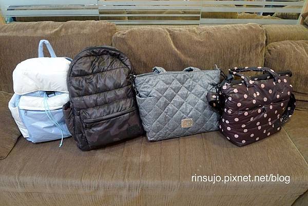 目前的媽媽包(左至右):ZATA馬卡龍後背包、喜舖B-Bag、Zoila輕量托特包、喜舖Face-Bag