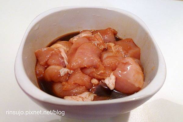 1、將雞胸肉切成適當的大小後,放入調好的醃料中稍微攪拌,再放入冰箱冷藏一晚