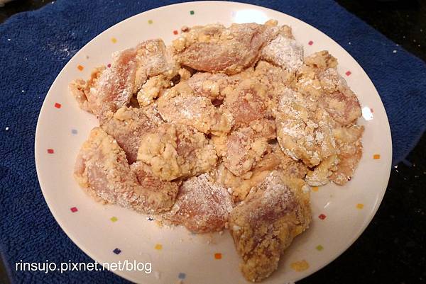 4、麵粉(或地瓜粉)放盤子上,將沾有蛋液的雞肉薄薄沾上一層粉