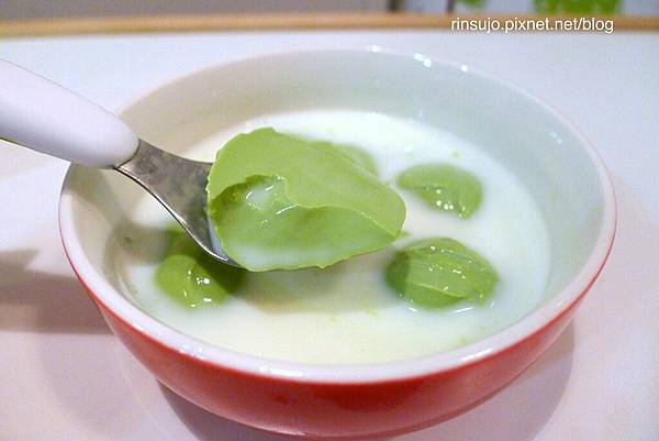 加到冰牛奶裏,稍微攪拌一下,加上奶香味的抹茶豆腐酪更加獨特