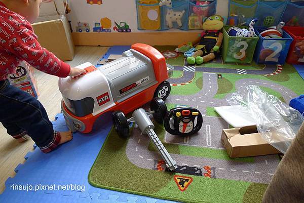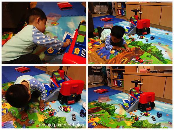 剛開始小湯不太會操作,我示範幾次後,他就可以自己玩上一陣子,滿地都是小車