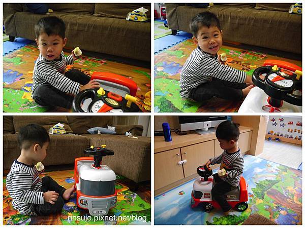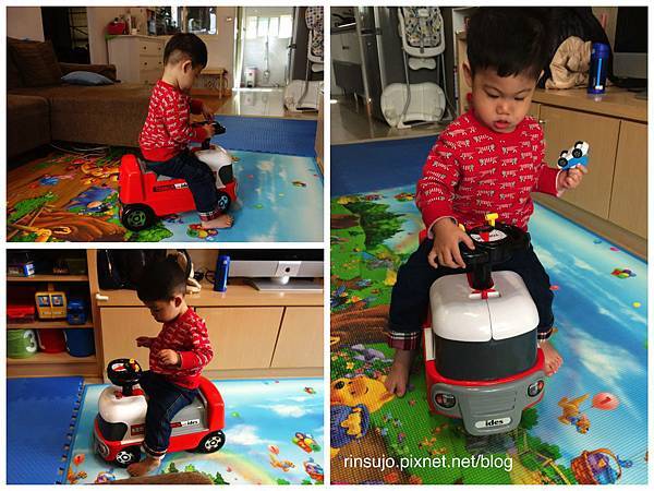 組裝完成後,小湯馬上試騎,手上還拿著附贈的小車,在家裏滑了好幾圈,玩到不想出門