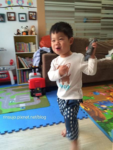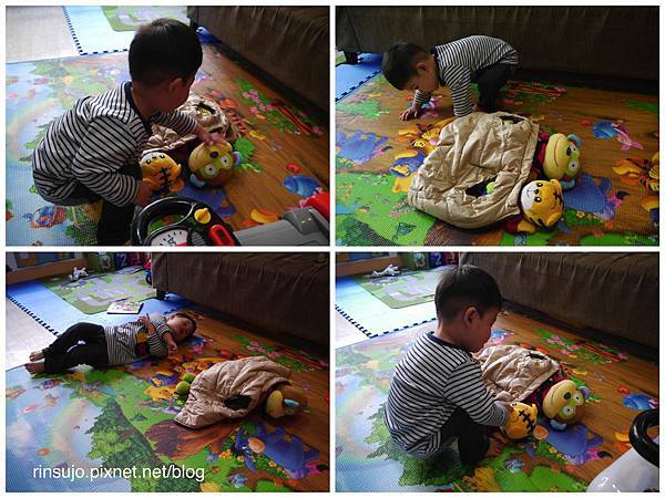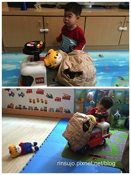 好東西要跟好朋友分享,所以開始當計程車司機,負責載他們回家,車上空調太冷,很貼心幫他們蓋被子,只是車子容量有限,一次只能載一個乘客,剩下的那個,只能躺在地上哭哭囉!(阿布跟巧虎,媽媽謝謝你們,因為有你們,媽媽不用配合演出奇怪的戲碼)