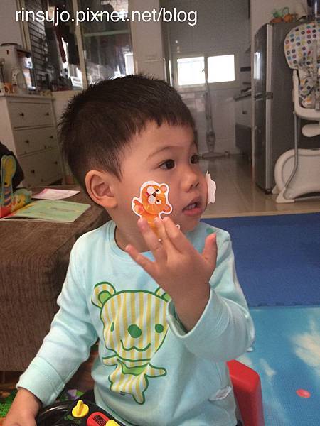 不知哪來的想法,把巧虎遊戲書上的貼紙貼在臉上,還很得意四處展示,最後貼紙的黏性消失,茶包兔大暴走。