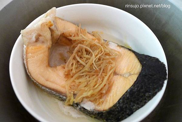 1、鮭魚洗淨後,用紙巾吸乾,舖上薑絲用電鍋蒸熟