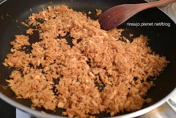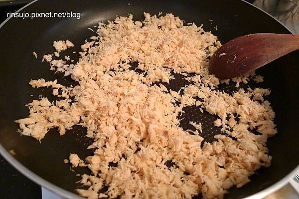 因為鮭魚本身就有油脂,我並沒有放油,一邊炒一邊用鍋鏟把魚肉弄得更碎