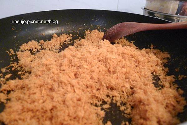 一邊炒記得一邊用鍋鏟把鮭魚壓碎喔!炒出來的成品就會像市售魚鬆的樣子