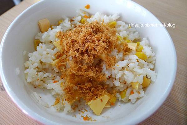 當天的午餐:蔬菜起司飯拌鮭魚鬆(一看就知道媽媽變不出新花招在偷懶)