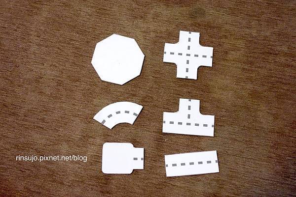 30×30cm的磁鐵片可以做出48個八角形,我總共畫了5個彎道、4個T形道路、4個十字路口、8個停車格、27個直線道路,我覺得直線道路多一點比較好拼出想要的道路形狀,反正在家玩,馬路大條點比較好耗小孩時間!