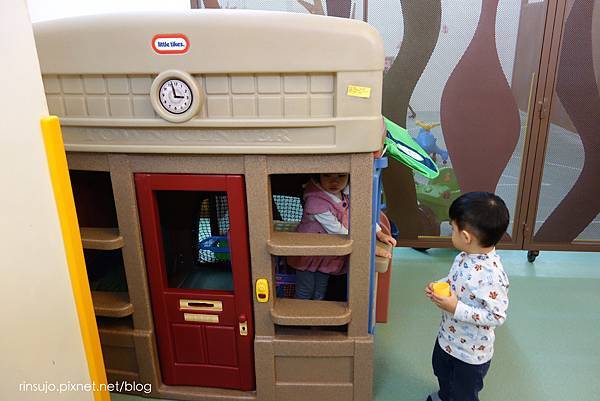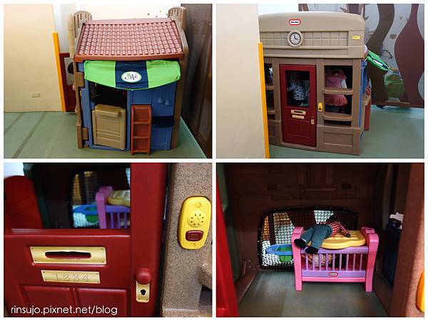 在小汽車區旁有個小房子,很多小女孩們在那裏來來去去,小湯對它的門鈴特別有興趣,一直在開關門喊:「有人在嗎?」裏面先佔位的小姐姐非常有耐心,等他玩夠後問他:「你要點什麼咖啡呢?」於是一人煮咖啡一人當忙碌的拆房子客人,咖啡廳非常熱鬧。小姐姐走後我才發現原來裏面有娃娃床,裏面還躺了小baby,難怪小女生們都聚集在這裏!