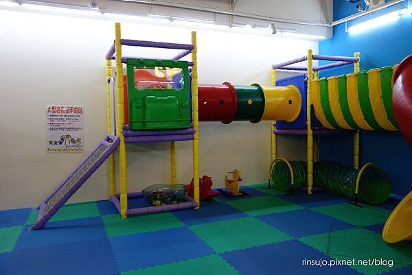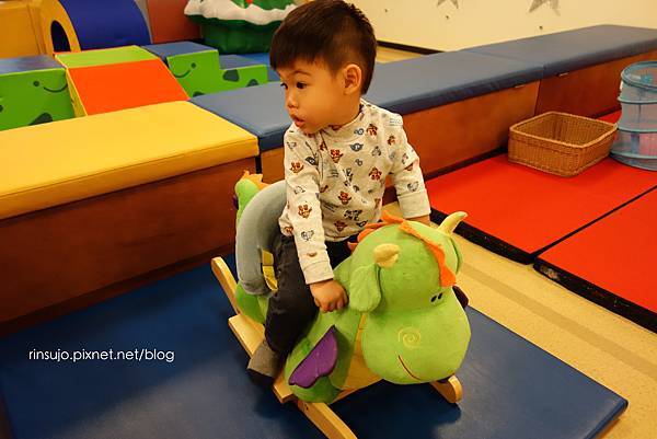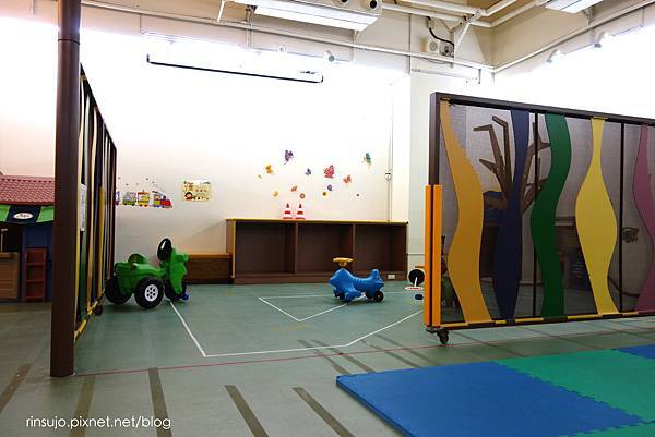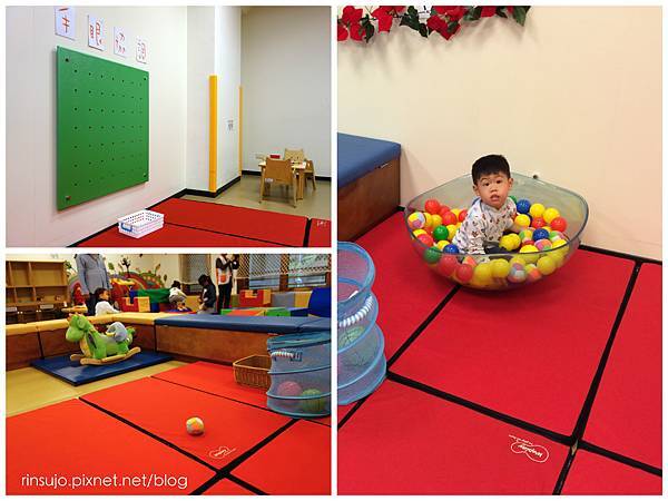 這裏適合學爬的孩子,地上舖舒服的軟墊,有各式球類玩具跟搖搖馬,還有手眼協調的洞洞遊戲,可以將小木棍塞進洞洞裏,小小孩會很喜歡這種遊戲。