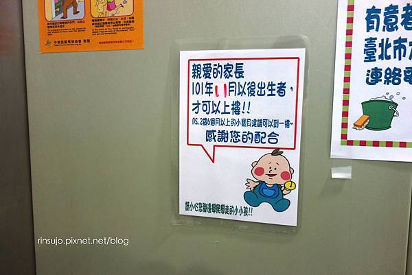 好不容易說服他放下鍋鏟,我們坐電梯上二樓探險,2樓比較適合0-2歲的嬰幼兒,電梯內有公告,大孩子不能上樓喔!