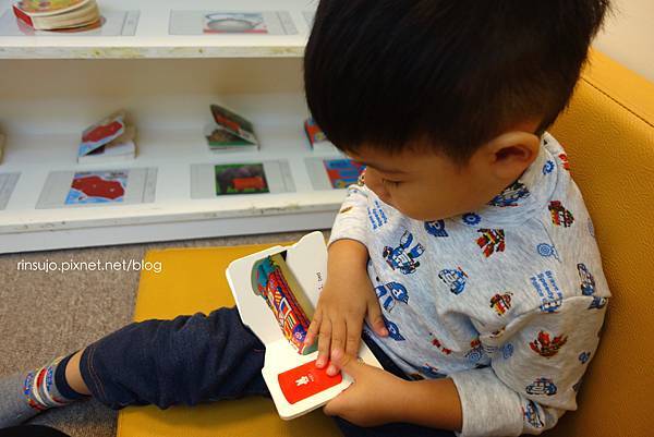 進門的第一個區域,有童書繪本跟創意磁鐵牆,在灑滿陽光的小桌上跟孩子一起讀繪本是媽媽的浪漫,但孩子只想「玩」,無視媽媽的心情,自己開心玩「車車書」,認真模擬開車的情境,遲遲不肯往下一關前進。