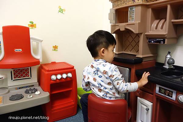 本來以為只有一樓才有廚具組,沒想到這個房間除了有更豪華寬敞的廚房組合,還有娃娃床,煮好可以直接餵食,真的太便利了,只是這裏的廚具組比較低,適合1歲多的小小孩,小湯迅速變身大廚,根本無視什麼高矮問題,繼續研發創意料理。媽媽真的無語問蒼天,到底是有多愛煮?都到親子館了,可以玩點家裏沒有的遊戲嗎?