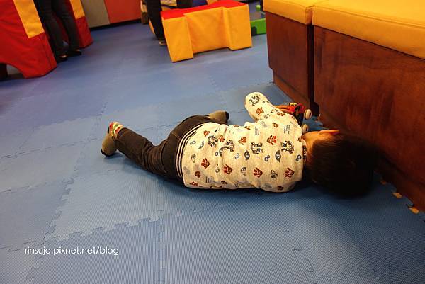 他真的很適合嬰幼兒的區域,因為如果在一樓躺這樣鐵定會被橫衝直撞的小哥哥姐姐們踩到,在baby區只要擔心他滾來滾去影響到經過的人就好,跟旁邊學爬的baby根本可以當好朋友。