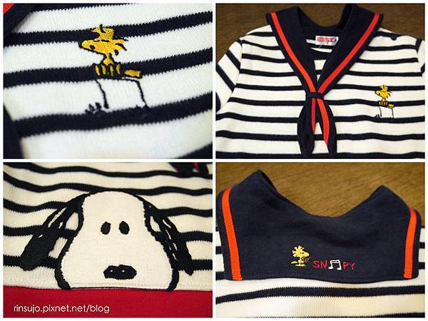 SNOOPY跟Woodstock的刺繡非常精緻,最特別的設計是活動式的水手領,一件衣服兩種變化,感覺很超值呢!它跟上一件紅色針織上衣相同,都是百分百純綿製造,穿在小小孩身上更讓人安心。