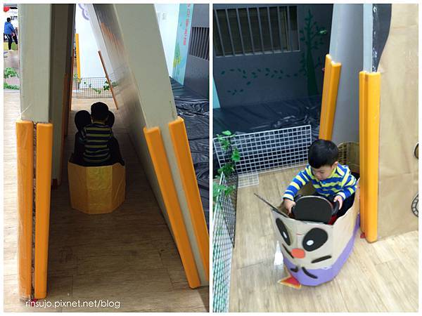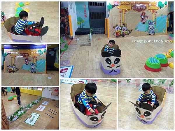 青蛙跳格子變成老鼠賽車場,普通的扭扭車套上老鼠外衣後,變得非常逗趣可愛,還有山洞的設計,每個小朋友一上車就不肯下來,場面一度非常混亂,幸好旁邊的志工幫忙維持秩序,我們很順利變身好幾次小老鼠追趕跑跳碰。