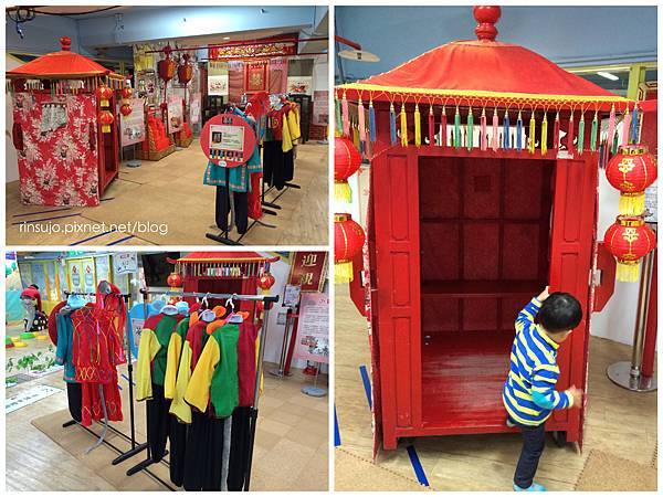 辦家家酒區是拜堂成親的地方,有大紅花轎、變裝戲服跟迎娶用具,甚至還有拜堂的擺設呢!