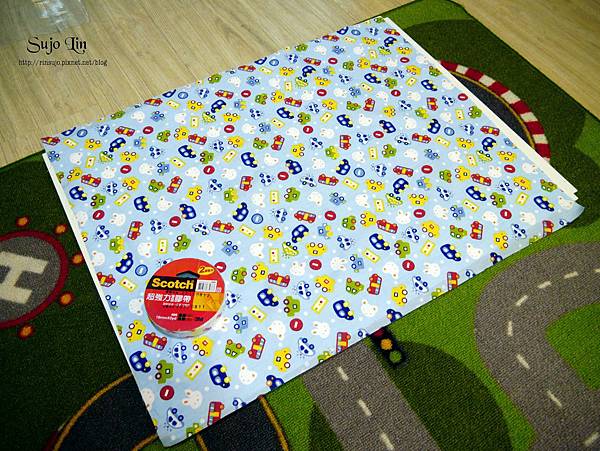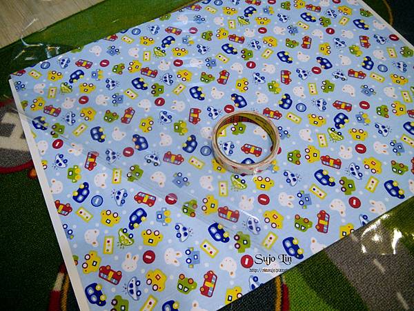 我使用的材料很簡單:大創買的小汽車零碼布(45×60cm)39元、薄防水桌布2尺(140×60cm)36元、3m超黏雙面膠39元,材料費114元。