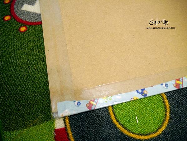 第二步,將布先燙平,再用雙面膠將布的四邊黏在桌面上,黏的時候要用盡全力將布拉平,不然後續容易出現皺折。