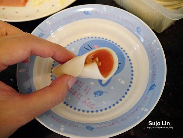 只要是「易熟」的食材都可以跟水餃皮捲在一起,我覺得飯捲最適合夏天食慾不振的小小孩,像吃點心般一口一口吃進營養的飯菜,不用在餐桌上聽小孩說:「妳煮得好奇怪!」「我不想吃這個耶!」這種讓人爆青筋的話,水餃皮真是媽媽的好幫手!