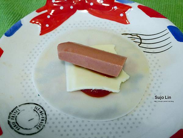2、水餃皮上舖火腿片及起司絲,捲起後在水餃皮邊緣塗些開水將開口黏緊