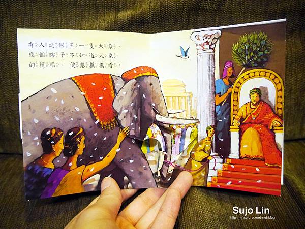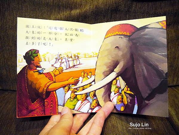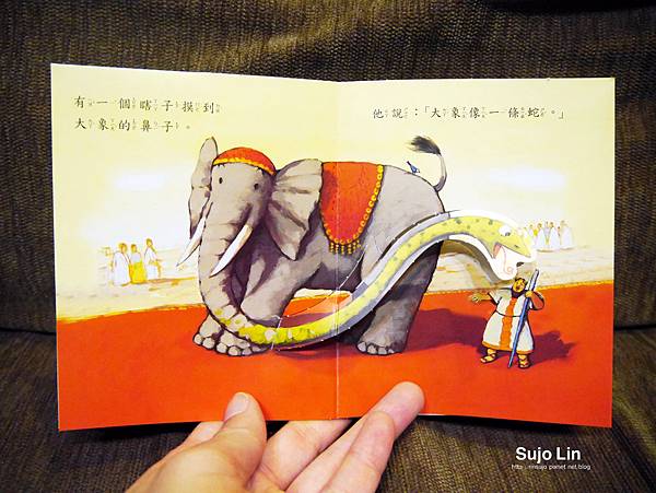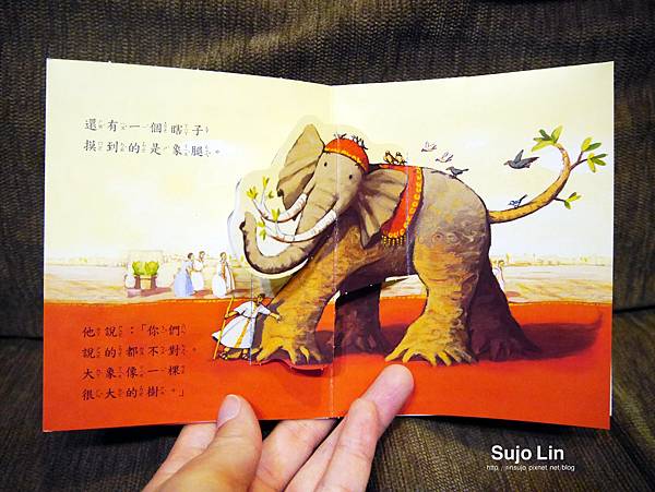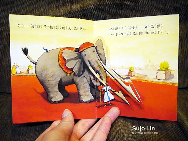 其實這就是「瞎子摸象」的成語故事,有個國王收到一隻大象,所有人好奇圍觀,這時來了六個瞎子也想知道大象長什麼樣子,國王讓他們每個人都去摸看看大象的模樣。(因為是濃縮版,立體書裏只是到三位瞎子的感想)