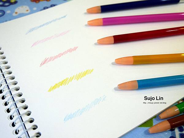 是屬於比較硬的筆芯,需要用點力才比較顯色,最大的好處是當孩子粗魯亂塗時不怕筆芯斷裂!