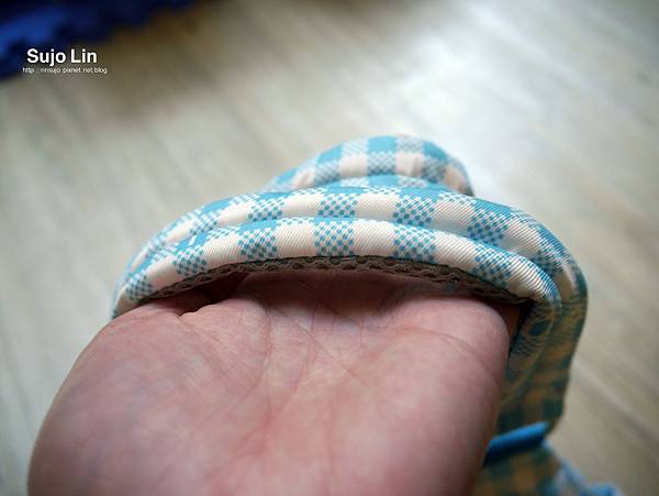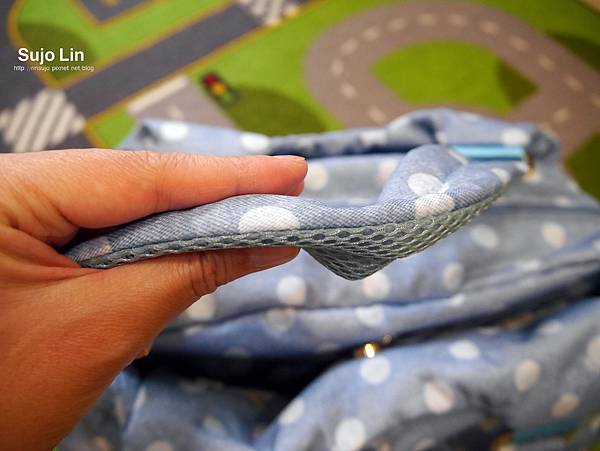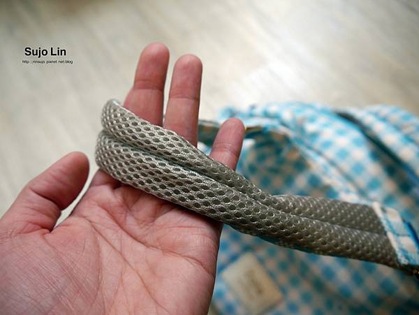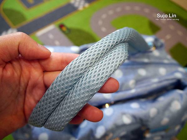 肩背帶摸起來Q軟,內有減壓設計,外層透氣網布讓它背起來更輕鬆且透氣,但實際試背後發現容易滑肩,而且肩膀部位有點卡(還是我手太粗?),所以我都是以手提或用長背帶側背。