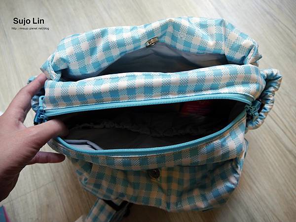 實際使用後發現它真的很能裝,小湯的水壺、備用衣物、餐具袋、消毒液、防蚊液、溼紙巾、衛生紙跟我自己的長夾(放後層剛剛好)、筆記本、手機、悠遊卡、雨傘等全都可以塞進去,它成為我最常使用的媽媽包,因為小湯3歲後出門用品大幅縮減,只是短暫外出或半天的行程,帶著小三明治包剛剛好,輕巧好背不笨重,而且桃樂絲格紋很好搭衣服,隨意穿搭都好看。