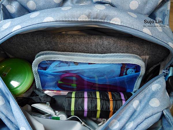 看似小巧可愛的小三明治包,收納功能非常強大,分前、中、後三大收納空間(所以才稱為三明治包),兩側鬆緊式口袋可以放水壺(不能太胖)、防蚊液、消毒液等,背面還有拉鍊袋收納悠遊卡等小物,當所有物品就位後,可以非常輕鬆拿到想要的東西而不用翻遍包包,這就是我喜歡媽媽包的原因!