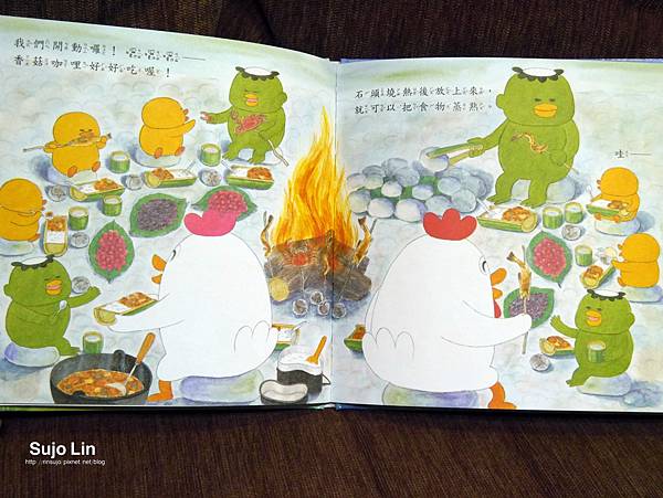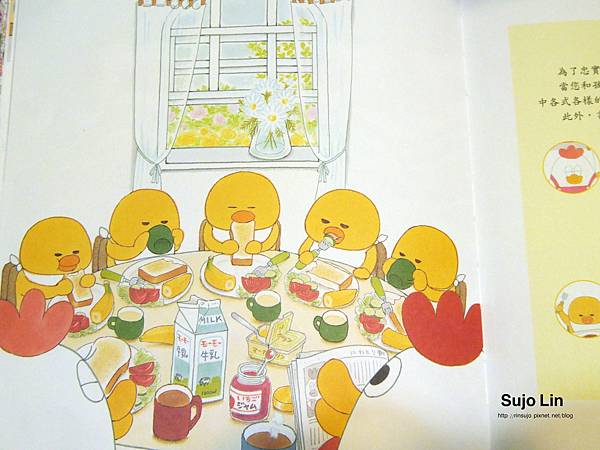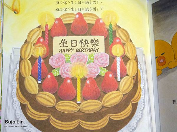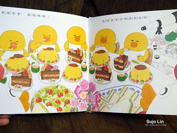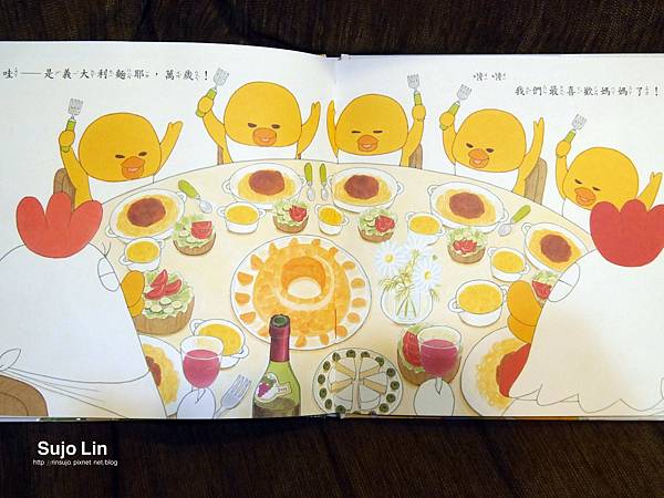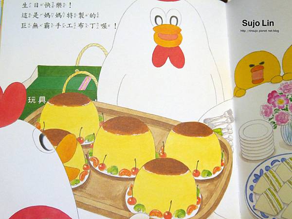 小雞們很幸福,有豐盛的生日大餐,還有媽媽親手做的特大號手工布丁呢!(書後有附布丁的食譜,可以在家試試)