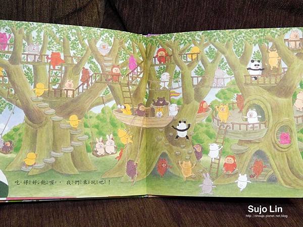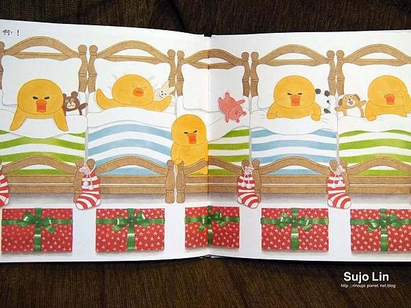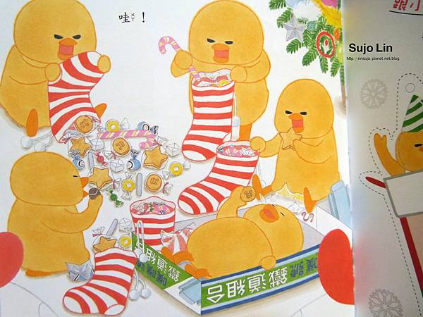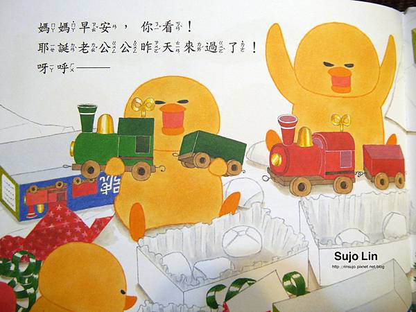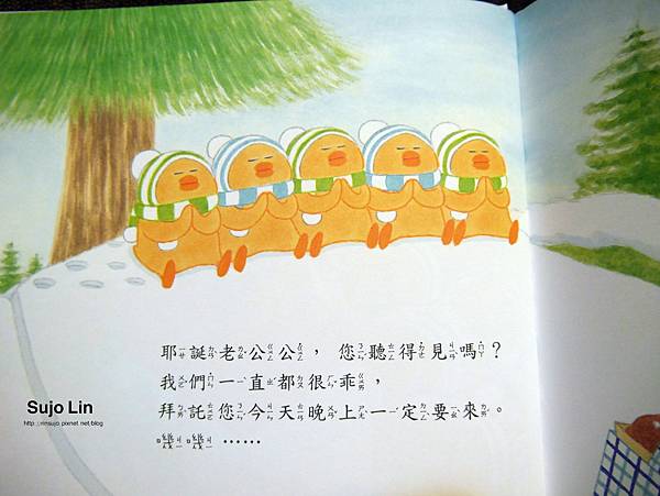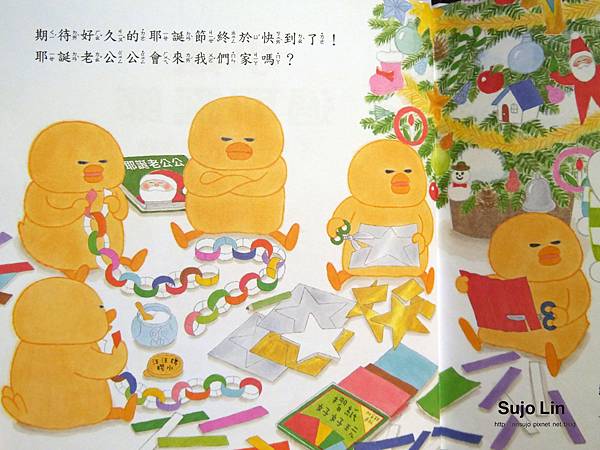 這本是去年耶誕節前小湯最愛的繪本,他跟故事中的小雞們一樣期待耶誕老公公送禮物過來,大約從耶誕節前一星期開始,每天都在問:「馬麻,老公公會來嗎?」「馬麻,我有乖,老公公會送什麼過來?」,看到小雞們忙著過節,我也開始跟小湯佈置耶誕樹,滿足小小孩的心願。