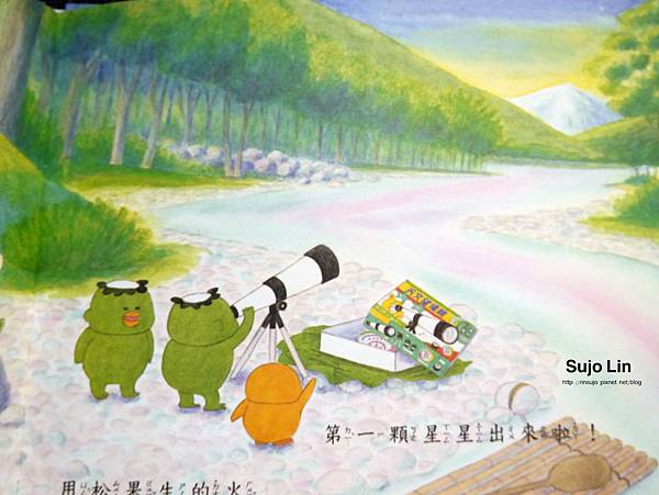 小雞跟河童家族一起升營火,分享美味的露營餐點,生日禮物--天文望遠鏡也派上用場,小河童和小雞們變成好朋友呢。