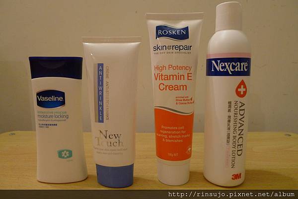 凡士林深層修護潤膚露、新歡除紋霜(同事送的)、ROSKEN高效維他命E修護霜、3M極潤感潤膚乳液