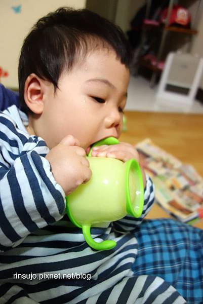 小湯沒有很愛它,老是拿來啃把手,而且這個杯子不防漏,小湯常常隨手亂丟,地上都是漏出來的水,最後只好先收起來。(最後變成小湯家家酒的工具,也算物盡其用)