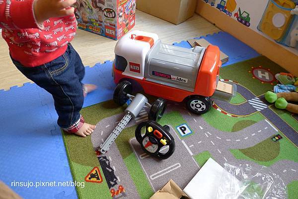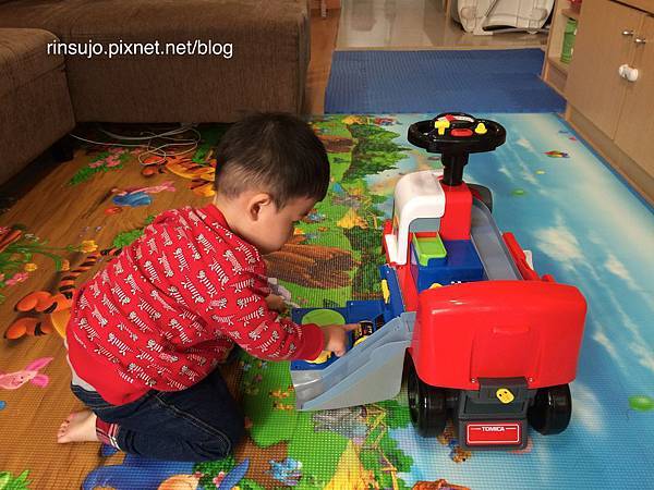 剛開始小湯不太會操作,我示範幾次後,他就可以自己玩上一陣子,滿地都是小車