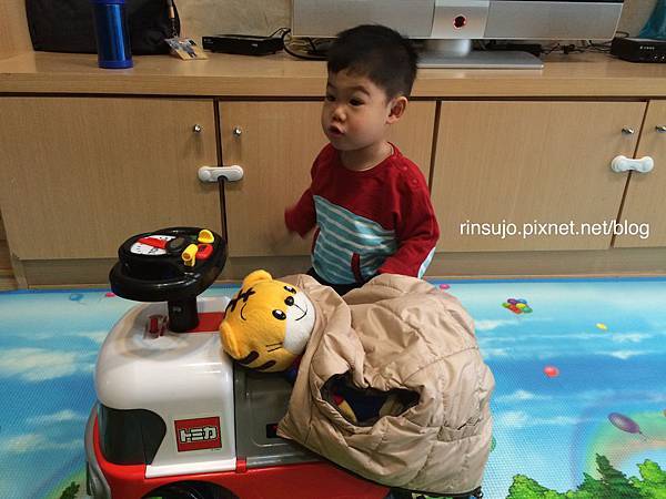 組裝完成後,小湯馬上試騎,手上還拿著附贈的小車,在家裏滑了好幾圈,玩到不想出門