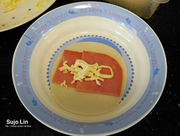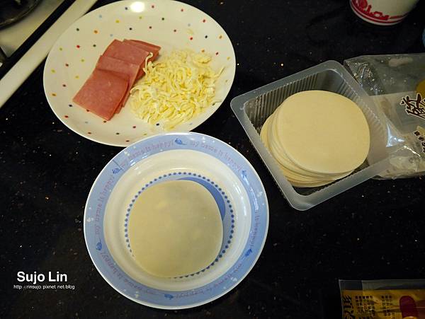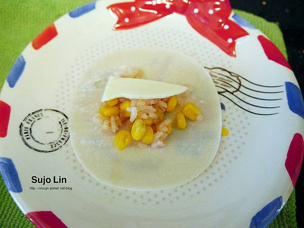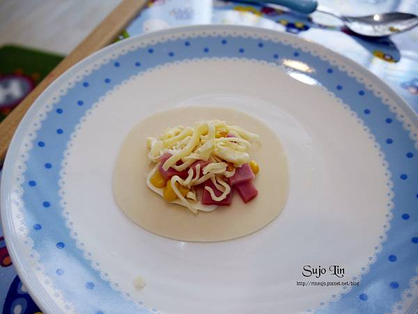 材料:水餃皮、玉米粒、火腿丁、起司絲、美乃滋