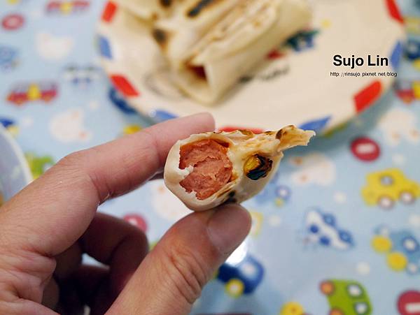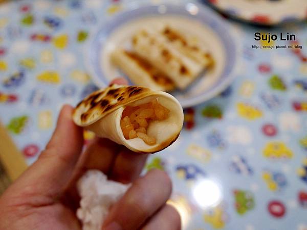 因為一邊煎一邊有人在旁邊吵鬧,有些燒焦,去除燒焦的部分,吃起來口感像捲餅,很適合當做下午茶小點心